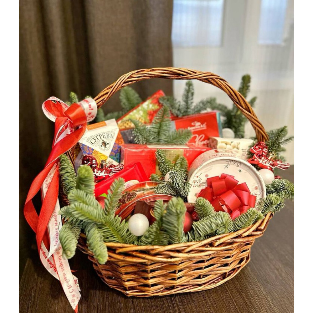 Состав Корзины: китайский чай, мед, фрукты, новогоднее оформление